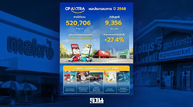 - ซีพี แอ็กซ์ตร้า (CPAXT) เผยผลประกอบการปี 2568 มีรายได้รวม 520,706 ล้านบาท และมีกำไรสุทธิ 9,356 ล้านบาท