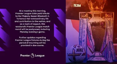พรีเมียร์ลีก อังกฤษ ได้ออกแถลงการณ์อย่างเป็นทางการในวันนี้ว่าการแข่งขันฟุตบอลในสุดสัปดาห์นี้จะถูกเลื่อนออกไปก่อน ทั้งนี้เพื่อเป็นการถวายความอาลัยต่อสมเด็จพระราชินีนาถเอลิซาเบธที่ 2 ที่เสด็จสวรรคตเมื่อวันที่ 8 ก.ย.ที่ผ่านมาขณะมีพระชนมพรรษา 96 พรรษา