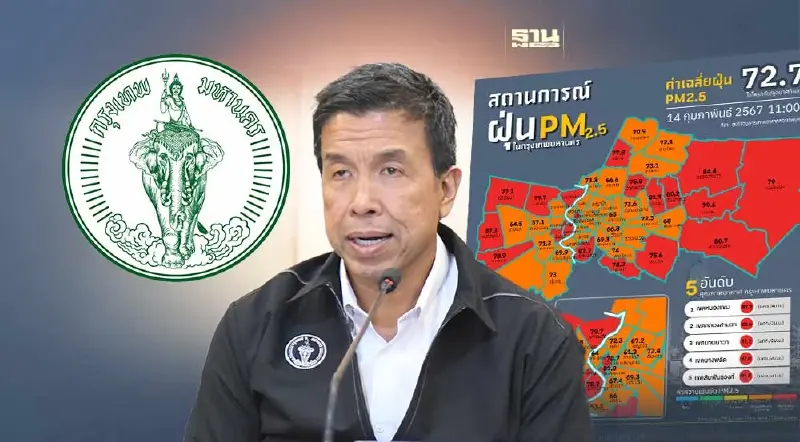 ศูนย์ข้อมูลคุณภาพอากาศ กทม. รายงานค่า PM2.5 ในพื้นที่กรุงเทพมหานคร วันที่ 14 ก.พ. 67 ณ เวลา 11.00 น มีค่ามากกว่า 75 ไมโครกรัม/ลูกบาศก์เมตร ขึ้นไป อยู่ในระดับสีแดง มีผลกระทบต่อสุขภาพ จำนวน 20 เขต คือ