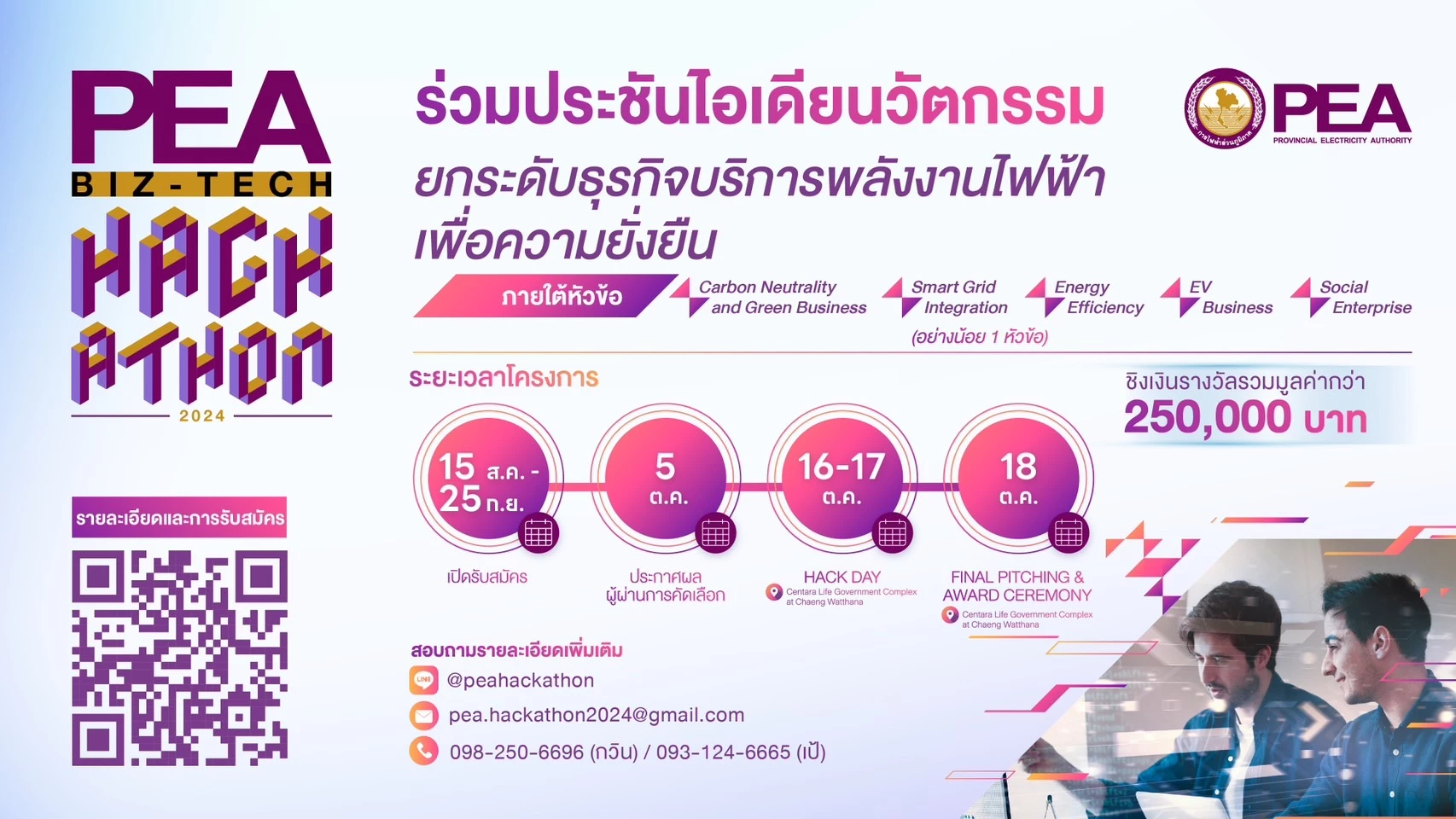การไฟฟ้าส่วนภูมิภาคเปิดรับสมัครแข่งขัน "PEA Biz-Tech HACKATHON 2024" ชิงเงินรางวัลรวมกว่า 2.5 แสนบาท