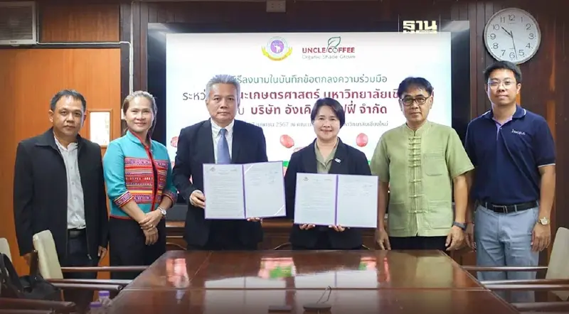 ผู้ช่วยศาสตราจารย์ ดร.ชูชาติ สันธทรัพย์ หัวหน้าศูนย์วิจัยบูรณาการสาธิตและฝึกอบรมนวัตกรรมการเกษตร คณะเกษตรศาสตร์ มหาวิทยาลัยเชียงใหม่ ร่วมลงนามบันทึกข้อตกลงความร่วมมือ กับบริษัท อังเคิล คอฟฟี่ จำกัด
