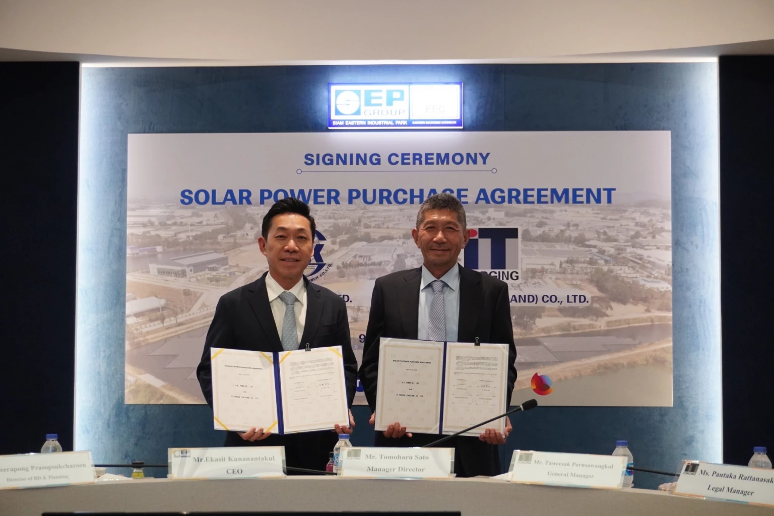 นายเอกสิทธิ์ คุณานันทกุล ประธานเจ้าหน้าที่บริหาร บริษัท G.K. Power จำกัด และนายโทโมฮารุ ซาโต้ กรรมการผู้จัดการบริษัท IT Forging (Thailand) จำกัด ร่วมพิธีลงนามสัญญาซื้อขายไฟฟ้าจากพลังงานแสงอาทิตย์แบบลอยน้ำ ขนาด 6.42 เมกะวัตต์ ระยะเวลา 15 ปี โดยใช้พื้นที่ภายในเขตประกอบการสยามอีสเทิร์นอินดัสเตรียลพาร์ค อ.ปลวกแดง จ.ระยอง โดยมีผู้บริหารจากทั้งสองฝ่ายและบริษัทพันธมิตรร่วมเป็นสักขีพยานอย่างพร้อมเพรียง