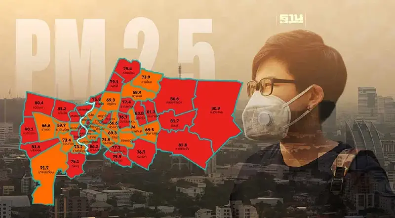 14 กุมภาพันธ์ วาเลนไทน์นี้ คนกรุงอ่วม จมฝุ่นพิษ ล่าสุด ศูนย์ข้อมูลคุณภาพอากาศกรุงเทพมหานคร ได้สรุปผลการตรวจวัด PM2.5 ประจำวันที่ 14 กุมภาพันธ์ 2567 เวลา 12.00-14.00 น.โดยตรวจวัดได้ 58.7-90.6 มคก./ลบ.ม. ,ค่าเฉลี่ยของกรุงเทพมหานคร 74.7 มคก./ลบ.ม. โดยค่า PM2.5 มีแนวโน้มเพิ่มขึ้น เกินมาตรฐานจำนวน 68 พื้นที่ แบ่งออกเป็นระดับสีแดง ผลกระทบต่อสุขภาพ จำนวน 33 พื้นที่ และ ระดับสีส้ม เริ่มมีผลกระทบต่อสุขภาพ จำนวน 35 พื้นที่