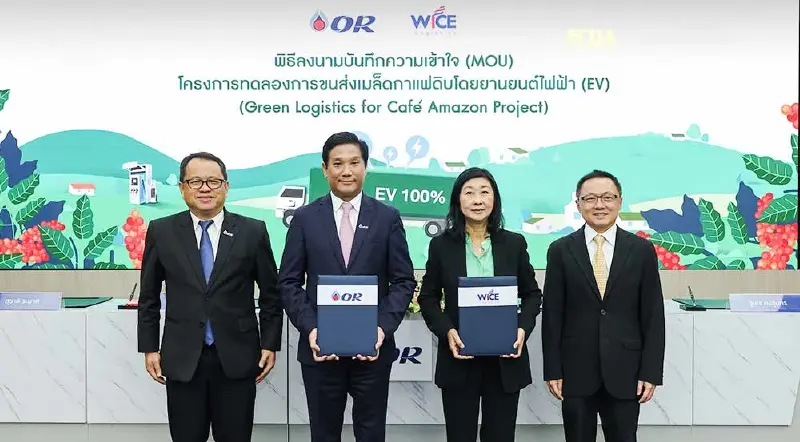 ซึ่งจะช่วยพัฒนาศักยภาพทางด้านเทคโนโลยีให้แก่ OR ต่อไป โดย OR และ WICE จะร่วมกันออกแบบ EV Truck พร้อมทดลองการขนส่ง โดยกำหนดเส้นทางการขนส่ง กรีน คอฟฟี่ บีน รูท (Green Coffee Bean Route) เพื่อขนส่งเมล็ดกาแฟดิบจากต้นทางที่โกดังเก็บเมล็ดกาแฟของ OR อำเภอแม่วาง จังหวัดเชียงใหม่ มายังปลายทางที่โกดังเก็บเมล็ดกาแฟที่ศูนย์ธุรกิจไลฟ์สไตล์คาเฟ่อเมซอน (OASYS) อำเภอวังน้อย จังหวัดพระนครศรีอยุธยา
