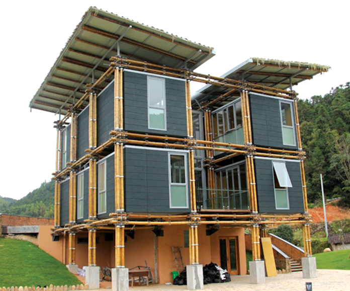 บ้านหลังนี้ใช้ “ไม้ไผ่” ซึ่งมีอยู่เป็นจำนวนมากในละแวกชุมชนเป็นวัสดุหลักในการก่อสร้าง เป้าหมายเพื่อลดต้นทุนการก่อสร้างและทดสอบการใช้นวัตกรรมธรรมชาติในการสร้างความเย็นสบายน่าอยู่ให้กับตัวบ้านอย่างยั่งยืน บ้านหลังนี้ตั้งอยู่ในชุมชนบ้านไม้ไผ่นานาชาติแห่งอำเภอหลงกวนในมณฑลเจ้อเจียงของประเทศจีน เป็นบ้านสาธิตที่ออกแบบโดยบริษัท สตูดิโอ คาร์เดนาส จากประเทศอิตาลี แนวคิดการออกแบบคือ การก่อสร้างบ้านที่สอดคล้องกับหลักฮวงจุ้ยของจีน ต้นทุนไม่สูง ใช้วัสดุธรรมชาติในพื้นที่ และที่สำคัญคือต้องประหยัดพลังงาน สถาปนิกตั้งใจโชว์โครงสร้างของระบบต่างๆ เช่น การต่อและประกอบลำไม้ไผ่ที่ใช้ใน “ระบบหล่อเย็น” อยู่ภายนอกตัวบ้าน (โดยสูบน้ำบาดาลขึ้นมาหล่อเลี้ยงไปตามลำปล้องไม้ไผ่ที่ประกอบไว้แทนท่อน้ำพีวีซี) ห้องหรือพื้นที่ต่างๆของบ้านแยกส่วนออกจากกันแบบโมดุล เพื่อสามารถอดหรือเพิ่มตามความต้องการใช้งาน แต่เน้นความโปร่งโล่ง มีผนังกั้นน้อยมาก เพื่อให้พลังงานบวก หรือ “ชี่” ไหลเวียนทั่วบ้านตามศาสตร์ฮวงจุ้ย ซึ่งก็หมายถึงการระบายถ่ายเทอากาศที่ดีทำให้ผู้อยู่อาศัยรู้สึกเย็นสบาย ไม่อึดอัดนั่นเอง
