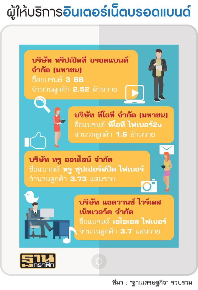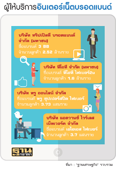 กลุ่มทุนสื่อสารทยอยแจ้งผลประกอบการในไตรมาสที่ 1/2560 ปรากฏว่าจำนวนผู้ใช้อินเทอร์เน็ตบอร์ดแบนด์ปรับตัวเพิ่มขึ้น โดย 3BB ออกมาเปิดเผยจำนวนผู้ใช้บริการเพิ่มขึ้น 106,401 รายเมื่อเทียบไตรมาสเดียวกันของปีก่อนอยู่ที่ 85,773 ราย ขณะที่ บริษัท แอดวานซ์ อินโฟร์ เซอร์วิส จำกัด (มหาชน) หรือ เอไอเอส จำนวนผู้ใช้เพิ่มขึ้น 72,400 ราย