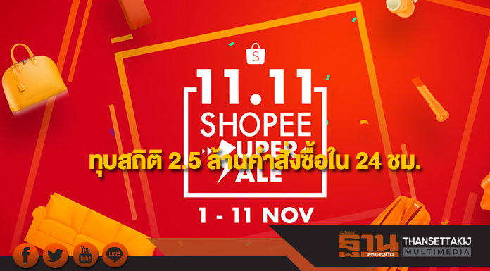 ช้อปปี้ สร้างปรากฏการณ์ทุบสถิติด้วยจำนวนออเดอร์สูงถึง 2.5 ล้านครั้งภายใน 24 ชั่วโมง กับแคมเปญ 11.11 Shopee Super Sale ลดสะท้านออนไลน์ ด้วยยอดการสั่งซื้อที่ที่เพิ่มขึ้นถึง 4.5 เท่า จากปีที่ผ่านมาและมียอดขายสินค้ารวมกว่า 7 ล้านชิ้น
