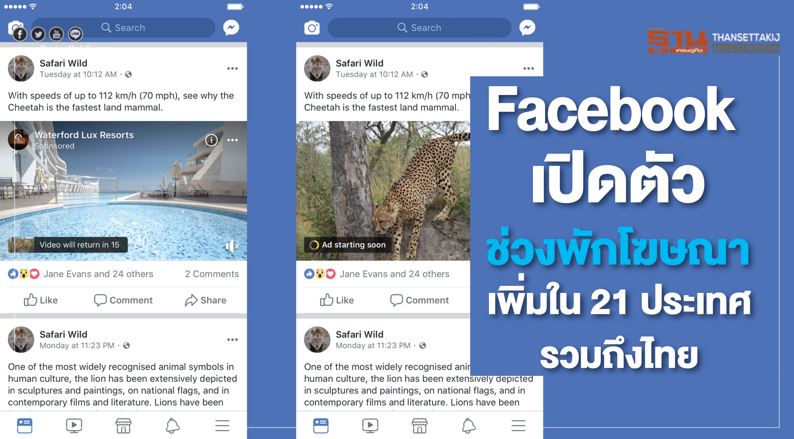 "Facebook" เปิดตัวช่วงพักโฆษณาเพิ่มใน 21 ประเทศ พร้อมให้บริการในภาษาอังกฤษและอีก 5 ภาษาเพิ่มเติม ได้แก่ ภาษาไทย เยอรมัน โปรตุเกส สเปน และฝรั่งเศส