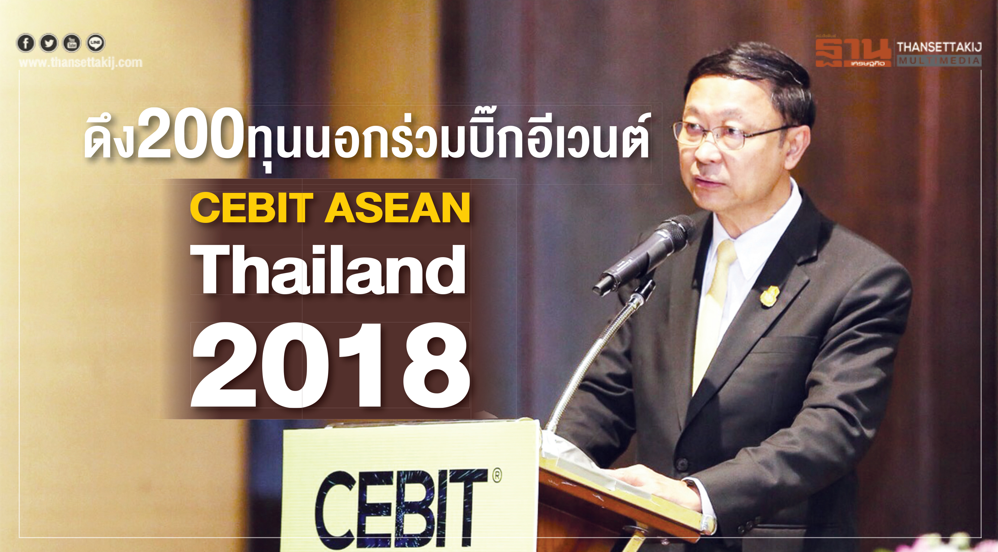 นายพิเชฐ ดุรงคเวโรจน์ รัฐมนตรีว่าการกระทรวงดิจิทัลเพื่อเศรษฐกิจและสังคม เปิดเผยว่า กระทรวงดิจิทัลฯ ได้มีการร่วมมือกับ กระทรวงวิทยาศาสตร์และเทคโนโลยี บริษัท อิมแพ็ค เอ็กซิบิชั่น แมเนจเม้นท์ จำกัด และดอชเช่อ เมสเซ่ เอจี ประเทศเยอรมนี เตรียมจัดงาน “CEBIT ASEAN Thailand 2018” เพื่อรวบรวมเทคโนโลยีและผู้เชี่ยวชาญด้านดิจิตอลจากทั้งภาครัฐและภาคเอกชน ในการแสดงนิทรรศการเป็นครั้งแรกของไทย ในวันที่ 18-20 ตุลาคมนี้ ที่ศูนย์แสดงสินค้าและการประชุมอิมแพ็ค เมืองทองธานี