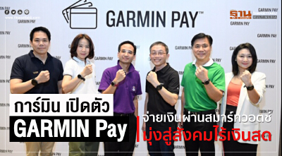 ล่าสุด GARMIN ได้ร่วมมือกับ 3 สถาบันการเงินชั้นนำ ได้แก่ ธนาคารกสิกรไทย ธนาคารไทยพาณิชย์ และบัตรกรุงไทย (เคทีซี) พร้อมทั้งเครือข่ายบัตรเครดิตระดับโลก 2 ราย ได้แก่ มาสเตอร์การ์ดและวีซ่าการ์ด พัฒนาบริการ GARMIN Pay ซึ่งเป็นการชำระเงินรูปแบบใหม่บนนาฬิกาสมาร์ทวอตช์ โดยผูกกับบัตรเครดิต เพื่อตอบไลฟ์สไตล์กลุ่มลูกค้าที่รักสุขภาพ ชอบออกกำลังกาย และมองหาความสะดวกในการชำระค่าสินค้าและบริการในสังคมไร้เงินสด ที่สามารถซื้อสินค้าและบริการได้ไม่จำกัดช่วงเวลาและกิจกรรม