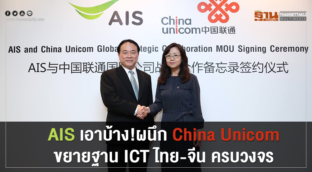 ล่าสุด AIS ผนึก China Unicom ผู้ให้บริการสื่อสารรายใหญ่ของประเทศจีน ประกาศความร่วมมือระดับทวิภาค ให้บริการด้านโครงข่าย ICT สำหรับกลุ่มลูกค้าแบบครบวงจรทั้งในและต่างประเทศ