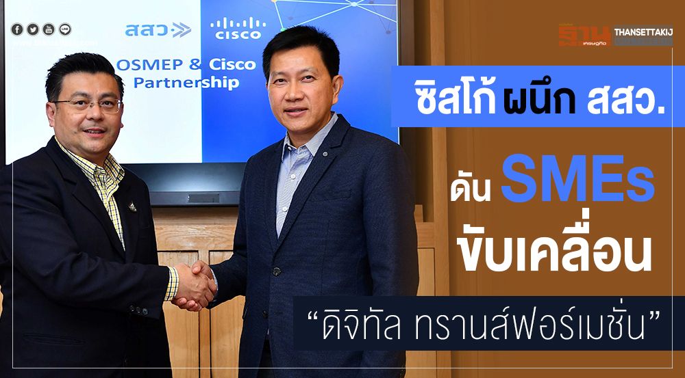 ซิสโก้ จับมือ สสว. ผลักดันเอสเอ็มอีไทยขับเคลื่อน "ดิจิทัล ทรานส์ฟอร์เมชั่น" ต่อยอดธุรกิจยุคดิสรัปชั่น ชี้เอสเอ็มอีในไทยลงทุนในเทคโนโลยีคลาวด์มากที่สุด ตามด้วยอัพเกรดฮาร์ดแวร์ไอที และไซเบอร์ซีเคียวริตี้