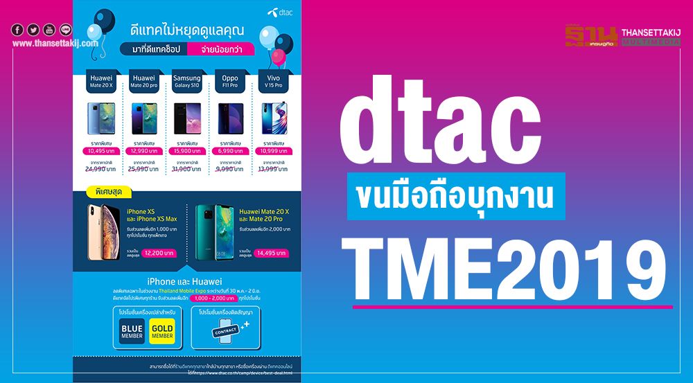 สำหรับข้อเสนอโปรโมชั่นของดีแทคในระหว่างวันที่มีงาน Thailand Mobile Expo ทั้ง iPhone และ Huawei นี้ลดพิเศษเฉพาะในช่วงงาน Thailand Mobile Expo ระหว่างวันที่ 30 พ.ค.-2 มิ.ย.2562 ดีแทค จัดโปรพิเศษทุกร้าน รับส่วนลดเพิ่มอีก 1,000 -2,000 บาท ทุกโปรโมชั่น ทั้งโปรโมชั่นเครื่องเปล่าสำหรับ Blue member และ Gold member และโปรโมชั่นเครื่องติดสัญญา เป็นต้น