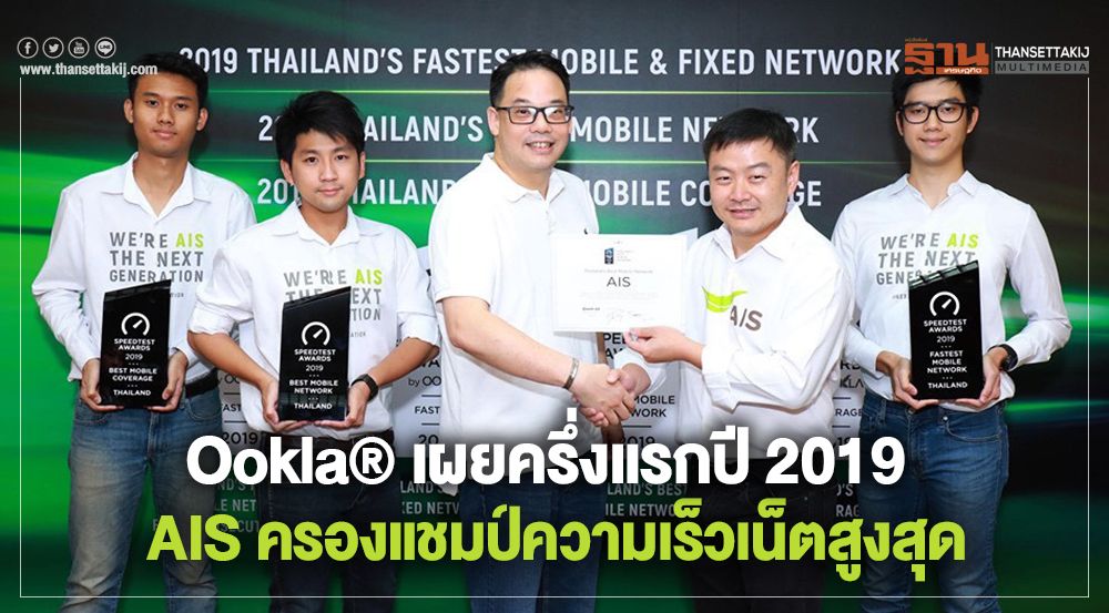 ทั้งนี้ผลทดสอบ Speed Test Awards จาก Ookla® ปี 2019 ประกอบด้วย 1.เครือข่ายมือถือที่เร็วที่สุดในไทย (Thailand’s Fastest Mobile Network) ได้แก่ AIS เป็นอันดับ 1 ด้วยคะแนนความเร็วในการให้บริการอินเทอร์เน็ต อยู่ที่ 19.05 มีความเร็วเฉลี่ยการดาวน์โหลด 23.04 Mbps ความเร็วเฉลี่ยการอัพโหลด 12.97 Mbps และค่าหน่วงเวลาในการตอบสนอง 32 ms พร้อมครองอันดับ 1 เครือข่ายมือถือที่เร็วที่สุดในพื้นที่กรุงเทพมหานคร ซึ่งเป็นจังหวัดที่มีการใช้งานเน็ตหนาแน่นที่สุด โดยวัดจากผู้ใช้มือถือในประเทศไทย ที่ร่วมกดทดสอบความเร็วอินเทอร์เน็ตมากกว่า 5 ล้านครั้ง ในช่วงเดือนมกราคม-มิถุนายน 2562
