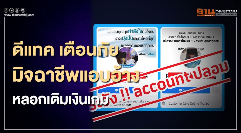 ดีแทค เตือนลูกค้าให้ระวังภัยจากมิจฉาชีพผ่านช่องทางเฟซบุ๊กในรูปแบบอ้างเป็นพนักงานดีแทค จากกรณีผู้ใช้บริการส่วนหนึ่งแจ้งว่าได้รับข้อความติดต่อจากมิจฉาชีพที่ใช้ช่องทางแชตผ่านทาง Messenger หลอกเติมเงินเกม โดยแอบอ้างเป็นพนักงานของ ดีแทค ทำการหลอกลวงว่าจะตรวจสอบการใช้บริการ หรือมอบสิทธิ์พิเศษต่างๆ ที่ลูกค้าต้องการให้ได้ โดยจะขอหมายเลขโทรศัพท์ที่ใช้งาน เพื่อหลอกนำไปสมัครทำธุรกรรมสำหรับซื้อเกมมือถือ ไอเทมเกม หรือเติมเงินเกม จากนั้นจะขอให้ลูกค้าแจ้งรหัส OTP หรือตัวเลข 4 หลักที่ได้รับทาง SMS จากการที่มิจฉาชีพไปซื้อเกมดังกล่าว ลูกค้าซึ่งให้ข้อมูลเลขหมายโทรศัพท์ และรหัส OTP ไปแล้ว ภายหลังจึงทราบว่าถูกมิจฉาชีพมีการ หลอกเติมเงินเกม โดยใช้ข้อมูลส่วนตัวไปชำระค่าบริการทำความเสียหายให้กับเจ้าของเลขหมายที่ต้องมาชำระหนี้แทน