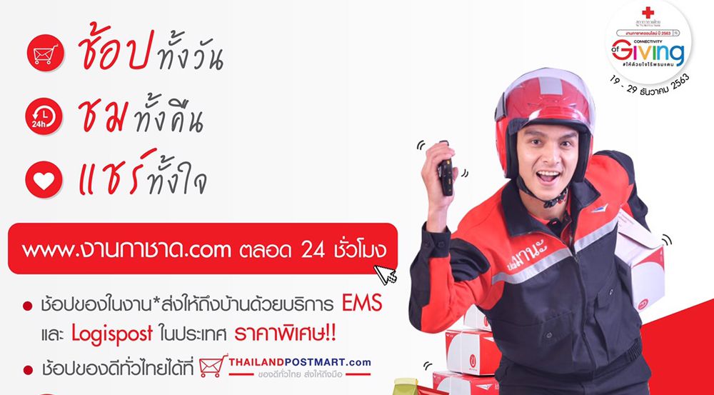 กรุงเทพฯ 21 ธันวาคม 2563 – บริษัท ไปรษณีย์ไทย จำกัด เชิญชวนเที่ยวงานกาชาดประจำปี 2563 ในรูปแบบ “งานกาชาดออนไลน์” บนแพลตฟอร์ม www.งานกาชาด.com พร้อมช้อปสินค้า “ร้านกาชาดไปรษณีย์ไทย” อาทิ สินค้าชุมชนและของดีทั่วไทยจากเว็บไซต์ Thailandpostmart ตราไปรษณียากรที่ระลึก นอกจากนี้ ไม่ว่าจะช้อปสินค้าจากร้านไหน ไปรษณีย์ไทยพร้อมให้บริการส่งให้ถึงบ้านด้วยค่าส่งอัตราพิเศษ และพิเศษเมื่อซื้อสินค้าจากร้านค้าโครงการส่วนพระองค์และเหล่ากาชาดจังหวัด รวมถึงของรางวัลจากการร่วมสนุก/เล่มเกมของร้านต่างๆ ไปรษณีย์ไทยส่งให้ฟรี
