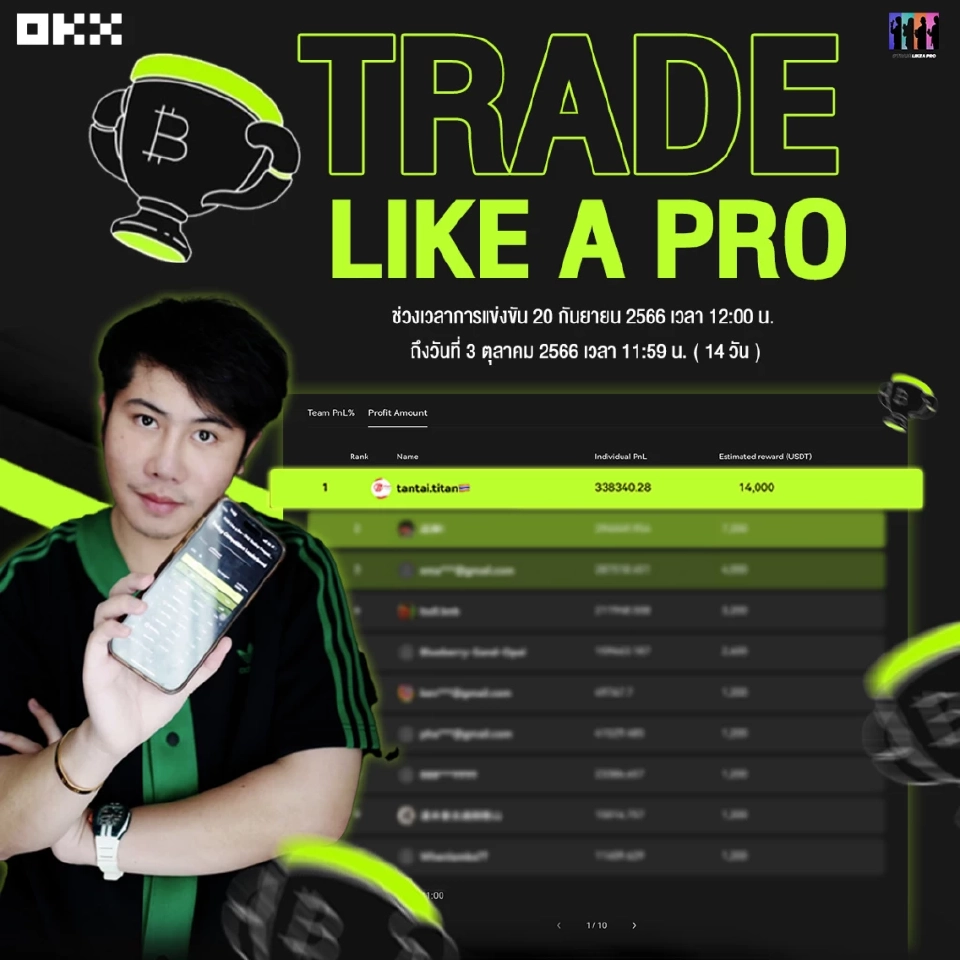 OKX กระดานซื้อขายแลกเปลี่ยนสินทรัพย์ดิจิทัลชั้นนำระดับโลก ที่มีผู้ใช้งาน 20 ล้านคน จากกว่า 100 ประเทศทั่วโลก จัดการแข่งขันเทรดคริปโต "TRADE LIKE A PRO" ระหว่างวันที่ 20 กันยายน 2566 ถึง 3 ตุลาคม 2566 เวลา 11.59 น. ชิงเงินรางวัลสูงสุดถึง 2,000,000 USDT หรือประมาณกว่า 70,000,000 บาท ซึ่งมีผู้เข้าร่วมลงทะเบียนแข่งเทรดที่ผ่านเงื่อนไขกว่า 11,000 คนทั่วโลกจากหลากหลายประเทศ โดยแบ่งประเภทการแข่งขันเป็น 2 แบบ คือ PNL % ทีม (Profit and Loss หรือ กำไรและขาดทุนนับเป็นอัตรา % ของการแข่งขันของคนในทีมนับรวมกัน) และ PNL บุคคล (Profit Amount นับแบบเดี่ยวผู้ที่เทรดได้กำไรสูงสุดภายในระยะเวลาการแข่งขันเป็นผู้ชนะ)