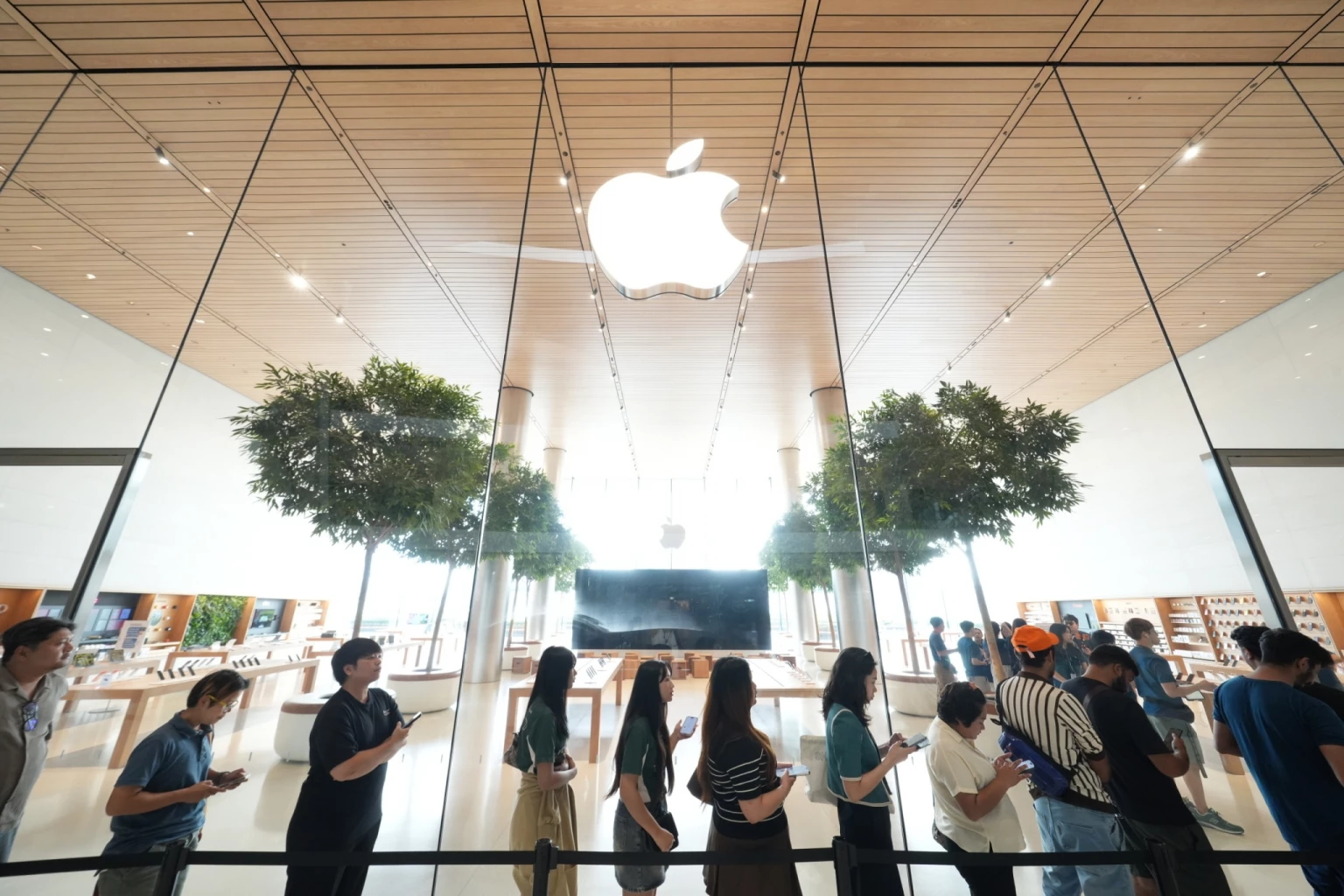 บรรยากาศหน้า Apple Store เต็มไปด้วยผู้คนจำนวนมากที่มารอคิวอย่างใจจดใจจ่อ เพื่อเป็นกลุ่มแรกในประเทศไทยที่ได้สัมผัสกับสมาร์ทโฟนที่อัดแน่นไปด้วยนวัตกรรมแห่งยุค