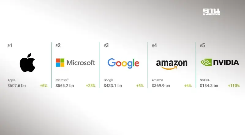 บิ๊กเทค 'Apple-Microsoft-Google-Amazon-NVIDIA' ครอง Top 5 แบรนด์มูลค่าสูงสุด