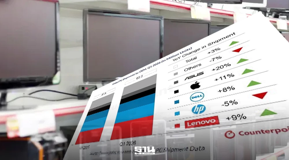 Counterpoint Research รายงานภาพรวมตลาดคอมพิวเตอร์ส่วนบุคคล (PC) ทั่วโลกในไตรมาส 1 ปี 2569 มียอดจัดส่งรวม 63.3 ล้านเครื่อง เพิ่มขึ้น 3.2% เมื่อเทียบกับช่วงเดียวกันของปีก่อน นับเป็นการฟื้นตัวของตลาดจากแรงหนุนสำคัญ 2 ด้าน ได้แก่ การเร่งสั่งซื้อเพื่อกักตุนสินค้าก่อนราคาหน่วยความจำปรับขึ้น และรอบการเปลี่ยนอุปกรณ์ใหม่หลังการสิ้นสุดการสนับสนุน Windows 10