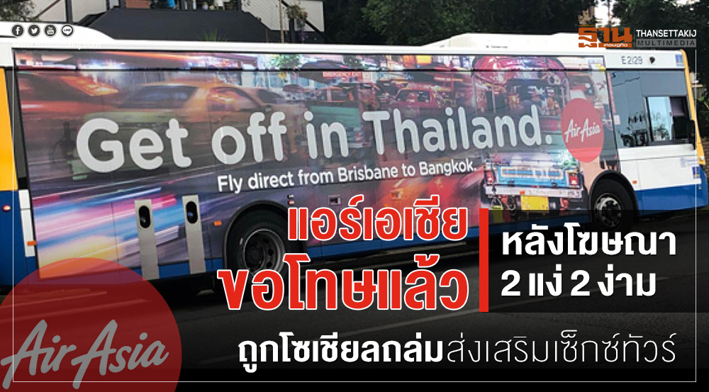 สื่อต่างประเทศรายงานว่า สายการบินแอร์เอเชียที่เป็นสายการบินราคาประหยัดและได้รับความนิยมในภูมิภาคเอเชีย ได้ออกแถลงการณ์ขอโทษอย่างเป็นทางการเมื่อวันที่ 26 มีนาคม 2562 หลังจากถูกกระแสสังคมและโซเชียลมีเดียกล่าวตำหนิติเตียนในวงกว้างเกี่ยวกับแคมเปญโฆษณาเที่ยวบินตรงระหว่างเมืองบริสเบน ประเทศออสเตรเลีย และกรุงเทพฯ โดยโฆษณาดังกล่าวปรากฏตามสื่อต่างๆ อาทิ ป้ายโฆษณาที่ติดตั้งบริเวณสนามบิน และโฆษณาข้างตัวรถบัสที่วิ่งให้บริการอยู่ในเมืองบริสเบน หลังเปิดตัวแคมเปญมาได้ราว 1 เดือน มีผู้ตั้งข้อสังเกตว่า ข้อความที่ใช้ในการโฆษณาที่ระบุว่า Get off in Thailand / Fly direct from Brisbane to Bangkok นั้นไม่เหมาะสม เนื่องจากมีนัยยะส่อไปในเรื่องทางเพศ สามารถตีความเป็นการเชิญชวนให้นักท่องเที่ยวมา “เซ็กซ์ทัวร์” ในประเทศไทย ข้อความโฆษณาดังกล่าวหากแปลตรงๆตัวว่า “ลงเครื่องที่ประเทศไทย บินตรงจากบริสเบนสู่กรุงเทพฯ” ก็ไม่น่าเป็นปัญหาอะไร แต่อีกนัยยะหนึ่ง สำนวน get off มีความหมายว่า การถึงจุดไคลแมกซ์ของการมีเพศสัมพันธ์