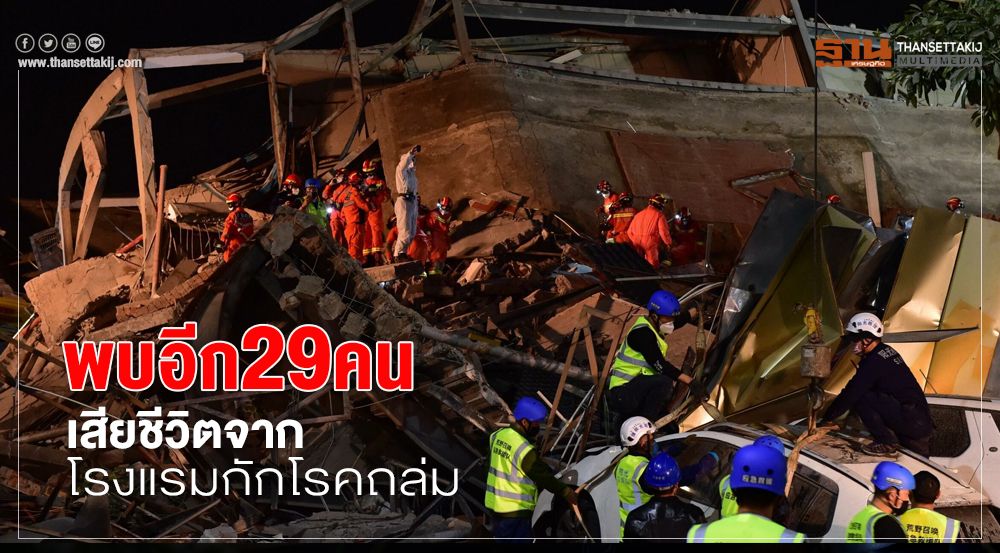 สำนักข่าวซินหัว รายงาน เมื่อวันพฤหัสบดี (12 มี. ค.) เจ้าหน้าที่กู้ภัยพบศพเหยื่อจากเหตุโรงแรมถล่มเพิ่มเติมส่งผลให้ยอดผู้เสียชีวิตจากเหตุโรงแรมดังกล่าวในมณฑลฝูเจี้ยนทางตะวันออกของจีนเพิ่มขึ้นเป็น 29 ราย