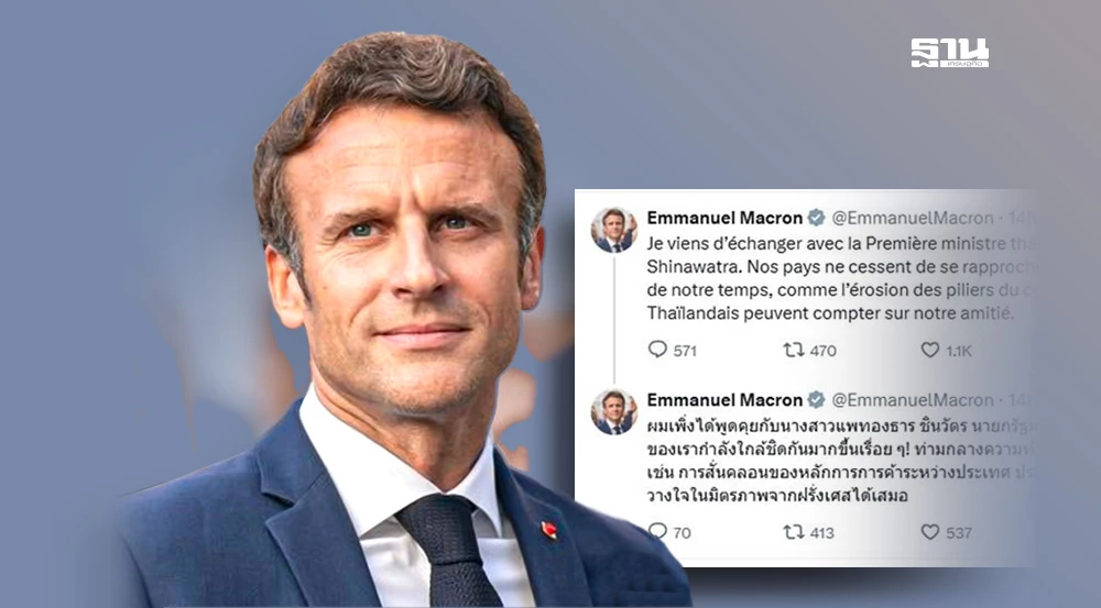 นายเอมานูแอล มาครง ประธานาธิบดีฝรั่งเศส เปิดเผยผ่านโซเชียลมีเดียหลังการโทรศัพท์หารือกับ น.ส.แพทองธาร ชินวัตร นายกรัฐมนตรีไทย เมื่อวันที่ 27 มิ.ย. 68 ที่ผ่านมา ภาษาฝรั่งเศสและภาษาไทยว่า “ผมเพิ่งได้พูดคุยกับนางสาวแพทองธาร ชินวัตร นายกรัฐมนตรีของประเทศไทย ประเทศของเรากำลังใกล้ชิดกันมากขึ้นเรื่อยๆ! ท่ามกลางความท้าทายใหญ่หลวงในยุคของเรา เช่น การสั่นคลอนของหลักการการค้าระหว่างประเทศ ประชาชนชาวไทยสามารถไว้วางใจในมิตรภาพจากฝรั่งเศสได้เสมอ”