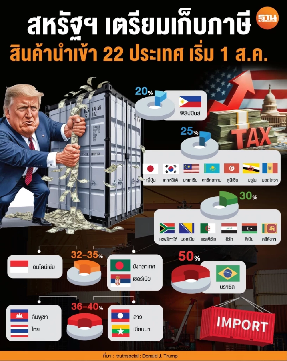 ประธานาธิบดีโดนัลด์ ทรัมป์ ของสหรัฐฯ ออกจดหมายประกาศปรับขึ้นอัตราภาษีนำเข้าต่ออีก 8 ประเทศ โดยรวมถึงชาติอาเซียนอย่างบรูไนและฟิลิปปินส์ ขณะที่บราซิลถูกเรียกเก็บภาษีสูงสุดถึง 50%