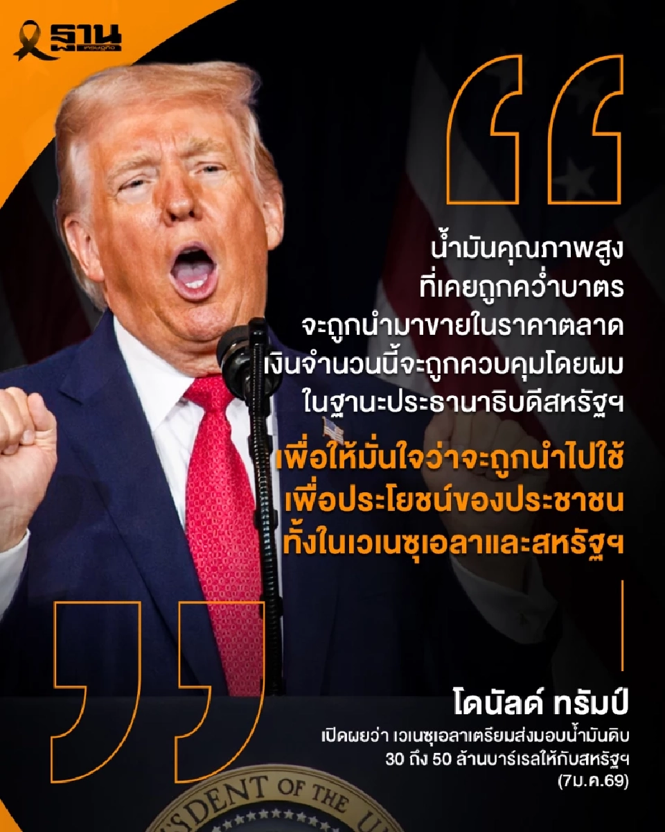 สำนักข่าวต่างประเทศทั้ง CNBC, Al Jazeera, BBC และ The Guardian รายงานตรงกันว่า โดนัลด์ ทรัมป์ ประธานาธิบดีสหรัฐฯ ประกาศว่า เจ้าหน้าที่รักษาการในเวเนซุเอลาเตรียมส่งมอบน้ำมันดิบจำนวน 30 ถึง 50 ล้านบาร์เรลให้กับสหรัฐอเมริกา