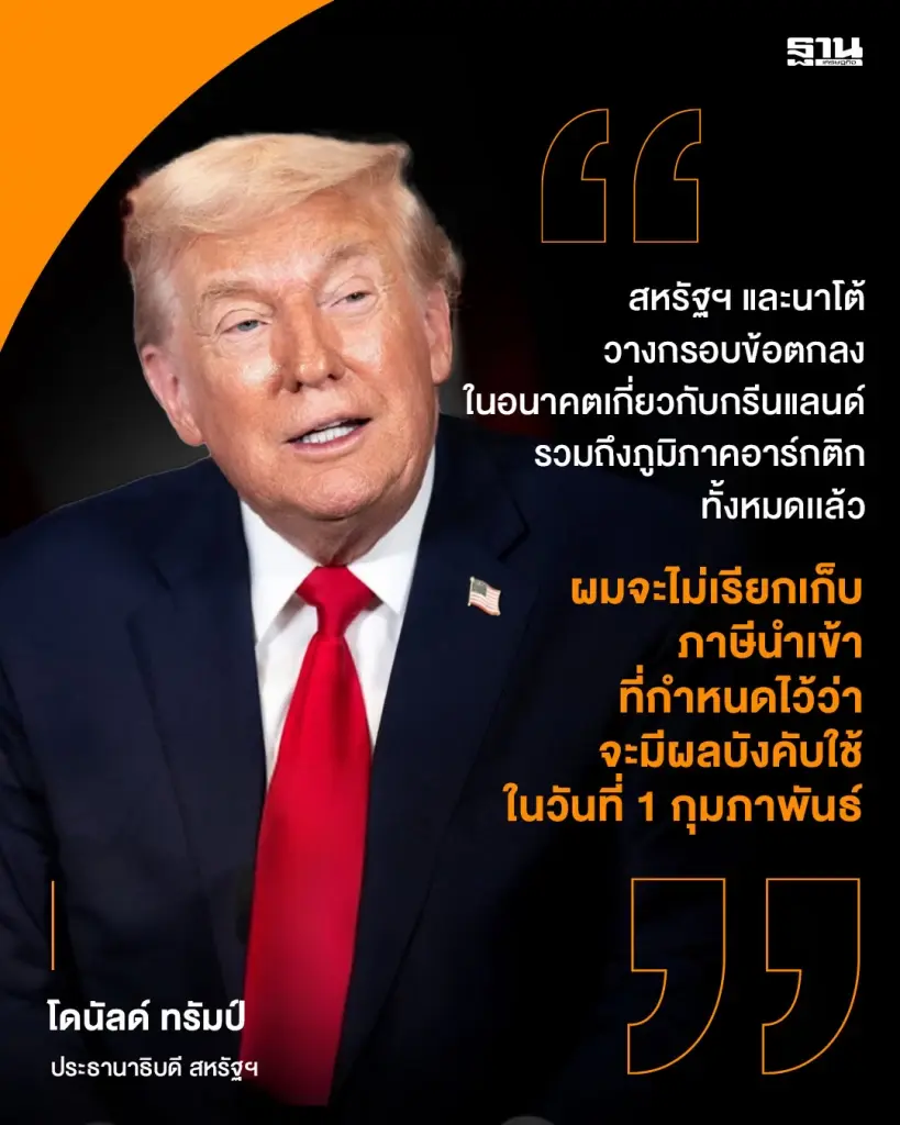 "ทางออกนี้ หากบรรลุผลสำเร็จ จะเป็นสิ่งที่ยอดเยี่ยมมากสำหรับสหรัฐอเมริกาและประเทศสมาชิก NATO ทั้งหมด และจากความเข้าใจตรงกันนี้ ผมจะไม่บังคับใช้มาตรการภาษีที่มีกำหนดจะมีผลในวันที่ 1 กุมภาพันธ์นี้”