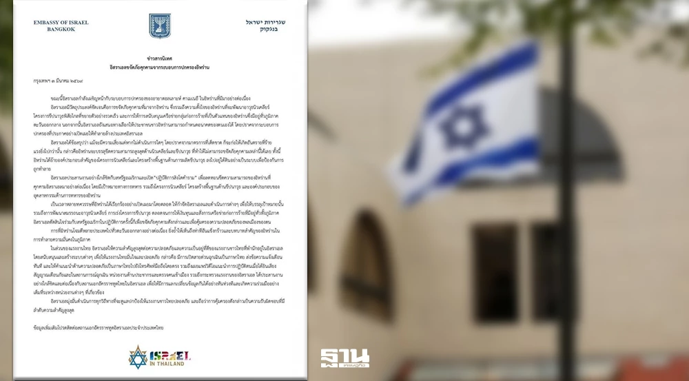 สถานทูตอิสราเอลในไทย ออกแถลงการณ์ ชี้แจง "ปฏิบัติการสิงโตคำราม" ร่วมสหรัฐ ขจัดระบอบปกครองอิหร่าน ยืนยันพร้อมดูแลแรงงานไทยในอิสราเอล