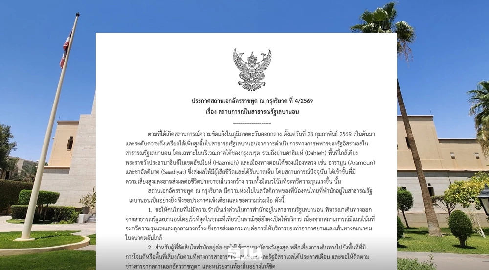 เมื่อวันที่ 4 มีนาคม 2569 สถานเอกอัครราชทูต ณ กรุงริยาด ได้ออกประกาศฉบับที่ 4 เรื่อง สถานการณ์ในสาธารณรัฐเลบานอน โดยเนื้อหารายละเอียดระบุว่า