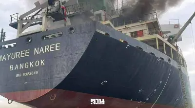 (ภาพจากกองทัพเรือไทย : เหตุเพลิงไหม้บนเรือบรรทุกสินค้าของไทย หลังจากถูกโจมตีในช่องแคบฮอร์มุซ วันที่ 11 มี.ค. 2026)