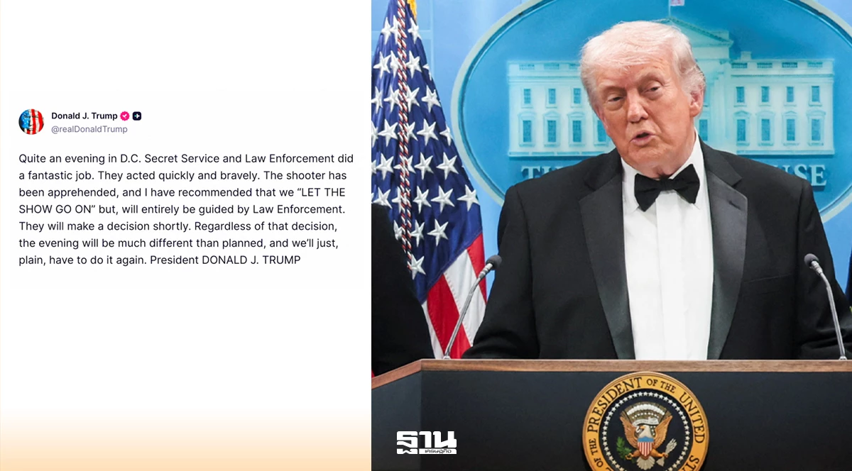 วันนี้ (วันที่ 26 เมษายน 2569) ประธานาธิบดี โดนัลด์ เจ. ทรัมป์ กล่าวหลังจากเกิดเหตุกราดยิง ในงานเลี้ยงอาหารค่ำของสมาคมผู้สื่อข่าวทำเนียบขาว ที่โรงแรมวอชิงตัน ฮิลตัน ในกรุงวอชิงตัน ดี.ซี.ว่า ผมเฝ้าดูอยู่ว่ามันเกิดอะไรขึ้น ผมน่าจะหมอบลงให้เร็วกว่านั้นด้วยซ้ำ เมลาเนียเองก็ดูจะรับรู้ได้ทันทีว่าเกิดอะไรขึ้น